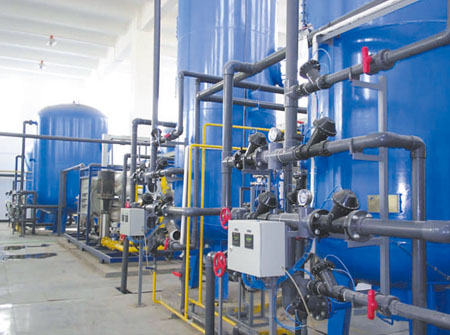 雙室浮動床是在單室浮動床中裝設一塊帶雙頭水帽的多孔板,分成兩室,上室裝填強型樹脂.下室裝弱型樹脂。在雙室浮動床中,兩種樹脂各自為對方提供了有利的工作條件,即弱型樹脂為強型樹脂提供了高再生水平。從而提高了強型樹脂的工作交換容量,而強型樹脂又允許弱型樹脂有較高的漏過,充分發揮了弱型樹脂的特長,這樣將提高再生效率、高再生容量的弱型和在高再生水平下工作的強型樹脂聯臺應用于水的化學除鹽,可以在1013的再生比耗下,使陽離子交換工藝的平均工作交換容量達到1300—1 700mep/LR,陰離子交換工藝的平均工作交換容量達到600- 900mep/LR,這是其它工藝所達不到的。另外,雙室浮動床還具有用水率低,運行操作簡單及可在高流速下運行等特點。