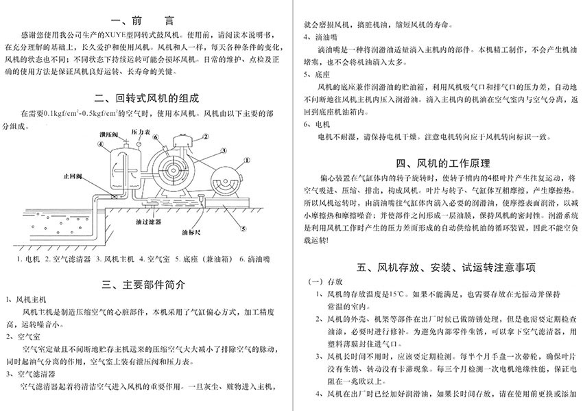 2、HF回轉式鼓風機結構精巧,主要由電機、空氣過濾器、鼓風機本體、空氣室、底座(兼油箱)、滴油嘴六個部分組成。