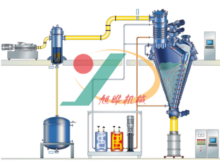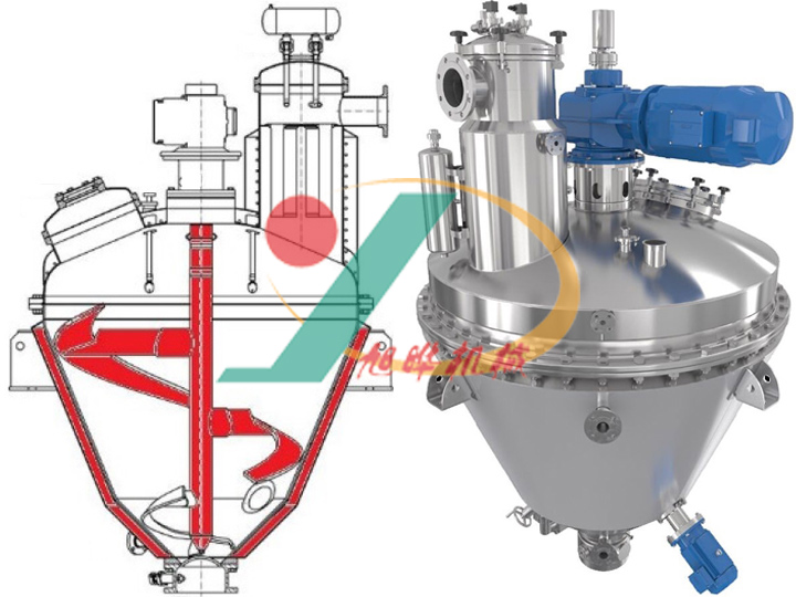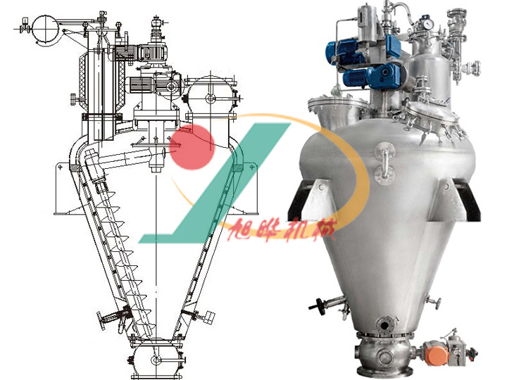 無錫旭曄機械開發的真空單錐干燥機是一種集減壓蒸餾、粉碎、混粉、干燥為一體的高效多功能全密閉立式真空干燥設備,全密閉立式真空螺帶干燥機的干燥效率是同等規格雙錐回轉真空干燥機、真空箱式烘3~5倍。真空單錐干燥機結合特殊干燥工藝,能適應粘度大、熱穿透性差,易滾球、易抱團成塊的物料的干燥。