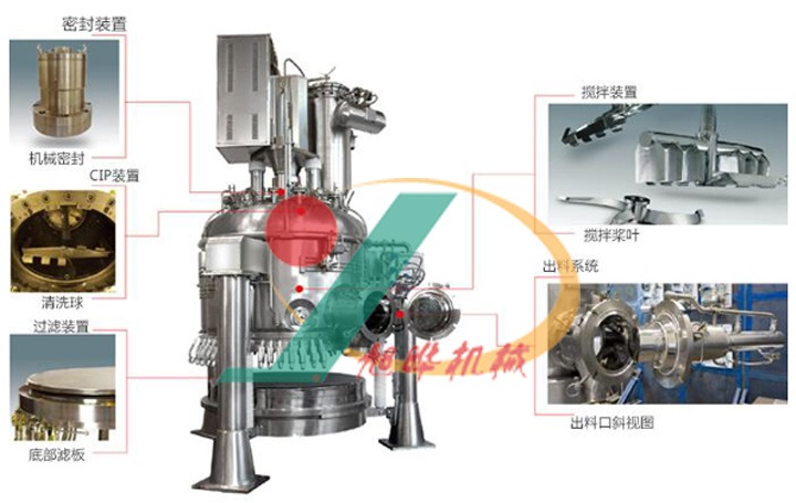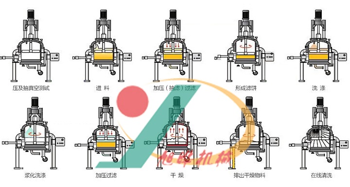 平板式過濾洗滌干燥三合一 結(jié)構(gòu)與原理 過濾洗滌干燥機(jī)(業(yè)內(nèi)俗稱“三合一”)能實(shí)現(xiàn)物料的過濾、洗滌、干燥、滅菌、卸料等連續(xù)工藝過程,其操作方式屬于分批式操作(間歇操作),廣泛應(yīng)用于制藥、食品、農(nóng)藥、化工等領(lǐng)域。過濾洗滌干燥機(jī)主要由承壓部分的立式罐體、加熱系統(tǒng)、攪拌系統(tǒng)(攪拌軸、攪拌槳、機(jī)械密封等)、攪拌升降機(jī)構(gòu)、傳動(dòng)機(jī)構(gòu)、過濾介質(zhì)、出料閥、噴淋裝置、滅菌裝置、液壓泵站、主電控柜(包括變頻器、PLC)等部件組成,實(shí)現(xiàn)了機(jī)、電、儀一體化。 在一批物料的過濾、洗滌、干燥、固體卸料等基本操作過程結(jié)束后,過濾洗滌干燥機(jī)還能用溶劑再將需要進(jìn)一步處理的物料溶解,連續(xù)地進(jìn)行下一步操作過程。
